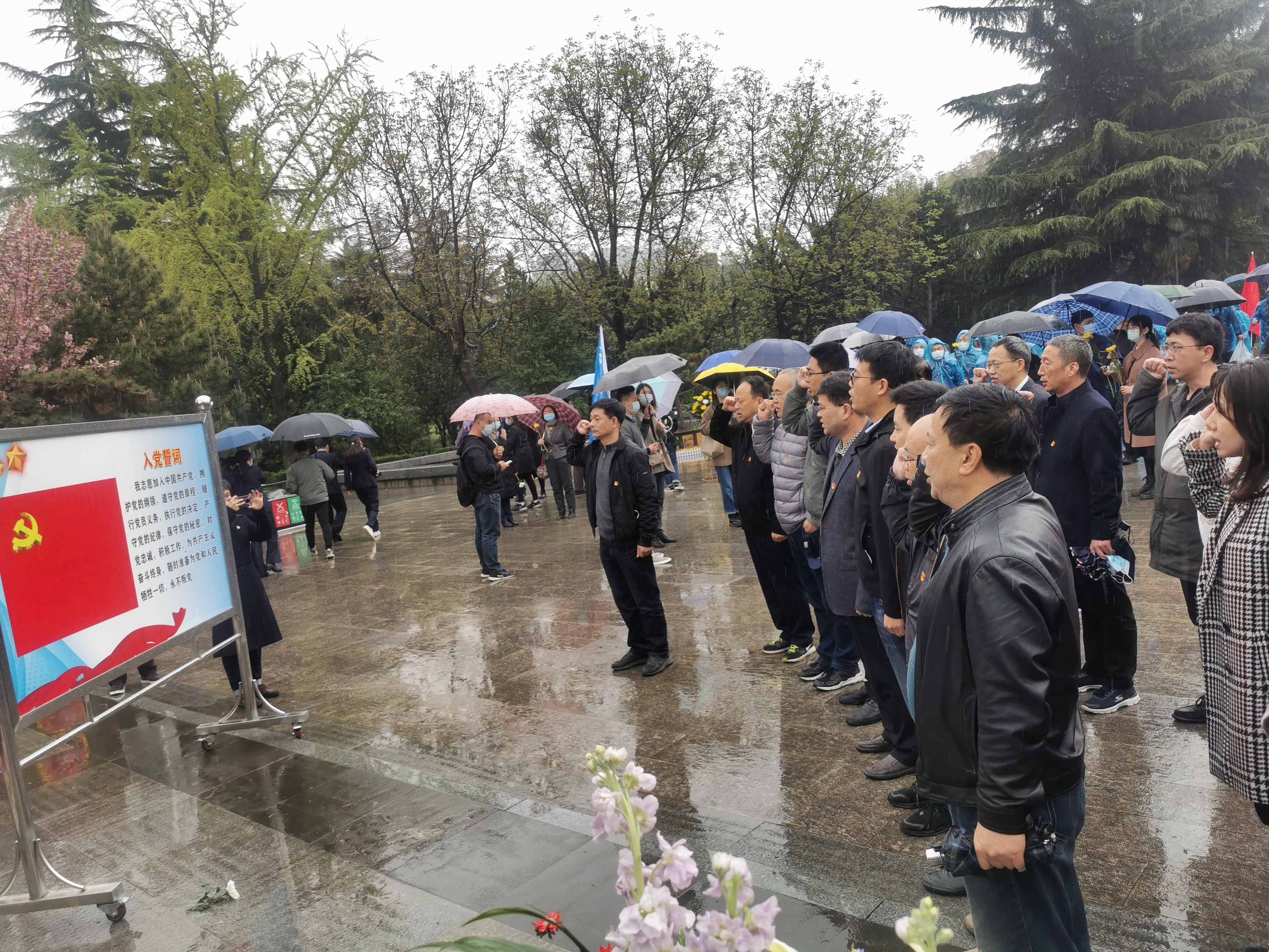 清明時節(jié),春雨瀝瀝,參加祭掃活動的同志們在紀念碑前穆然肅立,集體為革命先烈鞠躬默哀,重溫了入黨誓詞,并向戰(zhàn)斗英雄敬獻花圈,以崇高的敬意致以深切的悼念。