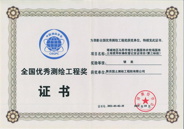 2021年中國測繪學(xué)會(huì)優(yōu)秀工程銀獎(jiǎng)(烏蘇市農(nóng)牧場確權(quán)項(xiàng)目)