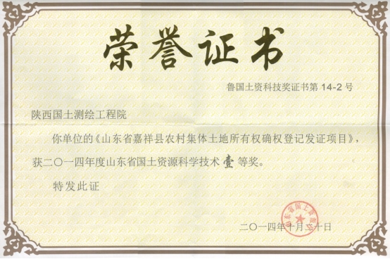 山東省嘉祥縣農(nóng)村集體土地所有權(quán)確權(quán)登記發(fā)證項目,獲2014年度山東省國土資源科學(xué)技術(shù)一等獎