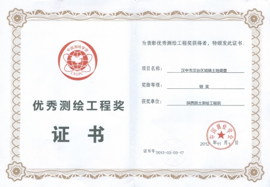 優(yōu)秀測繪工程獎證書