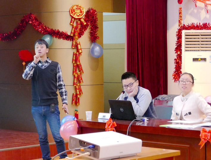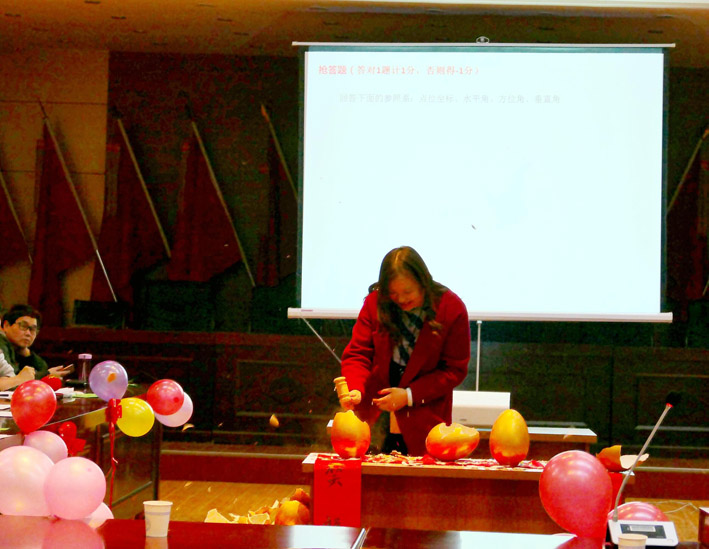23日上午,五彩繽紛的院三樓會(huì)議室,座滿了院內(nèi)外業(yè)的生產(chǎn)員工,這里正在進(jìn)行著迎新年聯(lián)歡會(huì)。院長(zhǎng)黨委書記張福良、黨委副書記、紀(jì)委書記、工會(huì)主席李世平、副院長(zhǎng)董乾坤、副院長(zhǎng)童雅妮、副院長(zhǎng)總工程師王小龍參加聯(lián)歡會(huì)。聯(lián)歡會(huì)的主題是知識(shí)競(jìng)賽。競(jìng)賽活動(dòng)以從金蛋里抽出張福良書寫的“雞聲窗前月,人笑福里春”春聯(lián)的歡樂氣氛中拉開帷幕。緊接著會(huì)場(chǎng)兩旁來自生產(chǎn)崗位的16支代表隊(duì)和周邊觀眾靜靜的盯著投影幕布。在王小龍的主持下,一道道知識(shí)競(jìng)賽問答題飛入幕布,各代表隊(duì)爭(zhēng)先搶答。每答對(duì)一道題,就會(huì)現(xiàn)場(chǎng)獲得一份精美的獎(jiǎng)品。答題內(nèi)容涉及天文地理、時(shí)事政治、民風(fēng)民俗、測(cè)繪知識(shí)等儲(chǔ)多領(lǐng)域。答題形式采取槍答、點(diǎn)答、擊鼓傳花等多種形式,副院長(zhǎng)童雅妮和主任工程師羅顯元專司點(diǎn)評(píng),現(xiàn)場(chǎng)氣氛緊張、熱烈,現(xiàn)場(chǎng)觀眾參與感強(qiáng)。選手們的精準(zhǔn)答題不斷贏得觀眾陣陣掌聲。